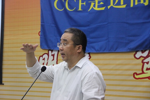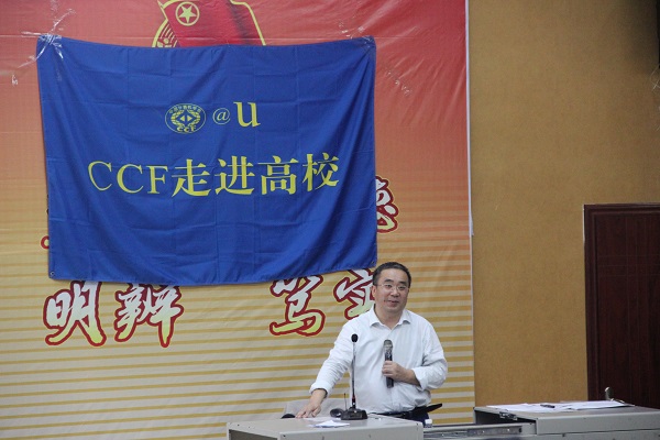 下午16时许,董教授开场以播放视频的方式,介绍了CCF的岁月历史及其存在的真正意义在于造福广大师生。董教授认为,课程评估是中国教学改革成败的关键,针对这个问题,他在BLOOM分类法和SOLO分类法的基础上,分析了我国教育出现的问题。他阐述了数学与计算机科学的区别,通过对“亚历山大的算法”的分析,他要求学子们了解并且掌握其解决方法。他结合“计算思维导论”课程和“计算机科学导论”实践,提出在大学第一门计算机课程的建设中,如何将课程评估与国际工程问题求解绑定在一起,如何提高计算思维能力,为学生今后的学习清除认知上的障碍。此外还介绍了微软产学合作项目—“计算思维结构”的课程情况。