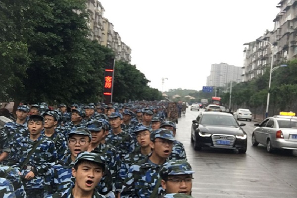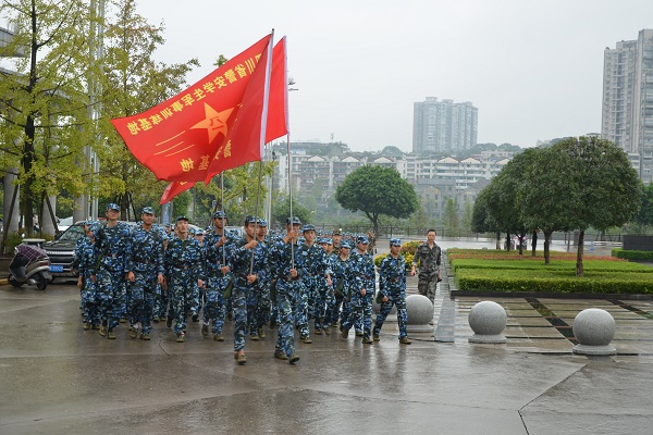 行军途中,旗帜在细雨中随风高高地扬起,每一个新生穿上迷彩,接受一份半军人的洗礼。在行进过程中,士气高昂,意志坚定,充分体现了前期军事训练的成效。途中进行了传歌活动,歌声慷慨激昂,整支队伍健步如飞,气势如虹。近四百人的队列无一人掉队,无一人放弃,仿佛就在一个小时的行军拉练中,瞬间成长为真正的大学生。