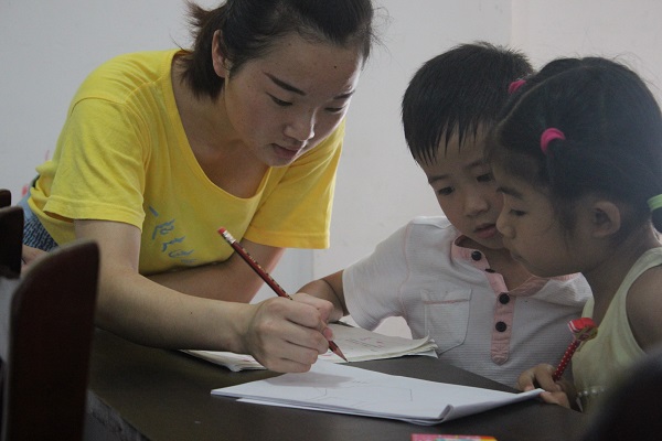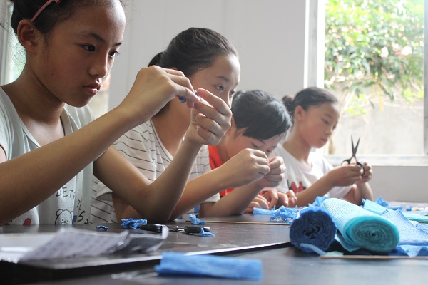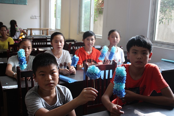 “一日之计在于晨”早晨是个学习的好时间,于是我队安排同学们拿出自己的暑期作业,在队员们的辅导下有条不紊地做着,但是小朋友终究是坐不住的,一会儿几个调皮的小男生就开始了乱跑、大闹的行为,着实让我们头疼。倒是高年级的同学认真做着作业,问着问题,一幅和谐欢笑的画面尽展眼前。时间总是流逝于指缝间,第二节课是音乐课,我们的汪瑾涵老师教他们唱起了四川版的《螃蟹歌》,整个教室充满着孩子们悠扬的歌声中。下午同学们总是来得那样早,然后展开属于他们的学习时光,不过接下来的则是小游戏和小手工制作。小学部孩子则是游戏:你比我猜。他们的脑袋里充满着各种奇思妙想,千奇百怪的答案一个更胜一个。当然初中生则是做着他们喜欢的玫瑰花,他们的笑容更是比花开的更艳丽。
