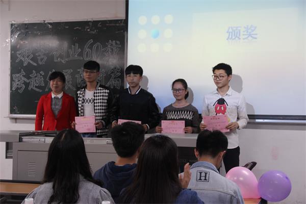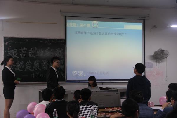 为感恩母校,庆祝建校六十周年,4月24日下午16时,我院于一教205开展了以“艰苦创业六十载,跨越发展谱新篇”为主题的知识竞赛观摩会。出席此次活动的有校团委刘晓波老师、校团委部分干部、二级学院部分代表、我院团总支书记李倩倩、辅导员吴昊、团总支、学生会部分代表以及部分学生代表。