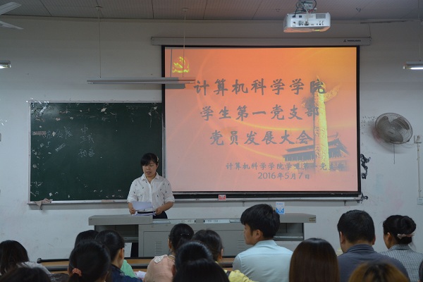 2016年5月7日14:30,计算机科学学院党员大会于一教105和207教室成功举行。本次大会主要由学习共产党党章,讨论我院2016年上半年党员的发展问题两部分组成。大会由我院学生第一党支部李倩倩老师以及学生第二党支部吴昊主持,参与此次大会的还有大二,大三的正式党员,预备党员和发展党员。