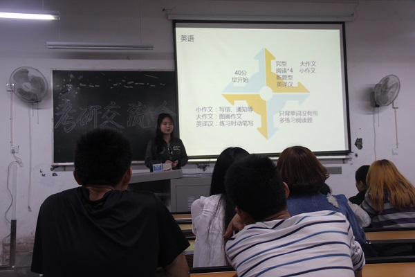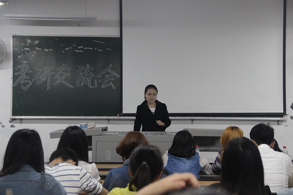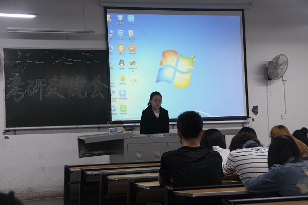 首先,何吉祥简单介绍了两位师姐的考研经历以及在学校里的一些事迹。交流会中,她们首先向在座同学做了个性的自我介绍,让同学们对他们有了初步了解。侯红英师姐就为什么要考研以及如何考研等问题做了详细讲解。她认为:考研一方面是为了就业,同时也是为了改变出身,为自己更好的发展打下基础。对于如何考研,龚艺师姐分别从专业、英语、政治三方面分析。专业复习上,要依据考试大纲;英语方面,重在练习,多动脑,勤动手;政治方面,大纲也很重要,同时注意答题时的条理。龚艺师姐以自己的切身经历向同学们讲述了考研的宝贵经验。她认为,考研的成功等于正确的方法加之不懈的努力以及恰当的复习材料。她风趣的语言、清晰地条理、开门见山的风格,赢得了同学们阵阵热烈的掌声。两位师姐也向同学们分析了面试中的相关技巧,使同学们对这一方面的知识有了进一步的了解。现场提问环节中,同学们积极踊跃,争先恐后的提出心中疑问。师姐采取各个击破的原则,有针对性的解决同学们的问题。