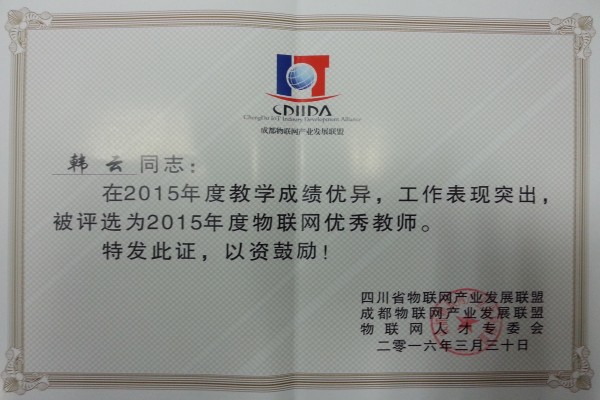计科学院韩云老师获2015年度四川省物联网人才培养