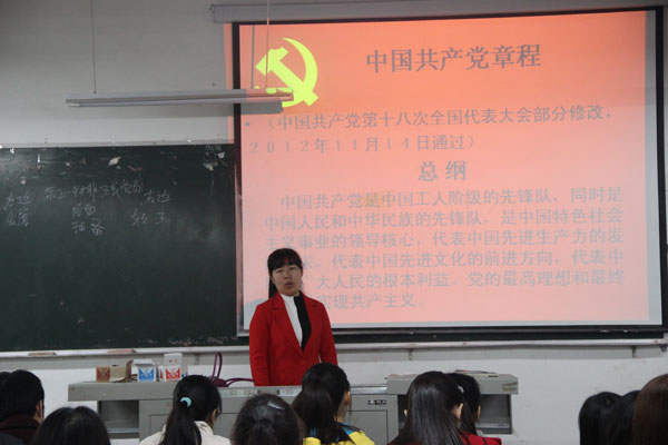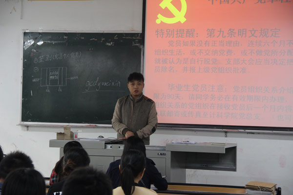 最后转正预备党员宣誓,他们声音高亢激昂:遵守党的章程,遵守党的记录……久久回荡在教室里,真正展现出了对党的崇高敬意。学生党支部书记李倩倩、吴昊老师对大会进行了总结,表示希望以后在各种有益活动中多看到党员身影,更多的人投身到党的事业:对党的认识更加明确,对党的基本知识更加了解,入党动机端正,对共产主义信念更加坚定。