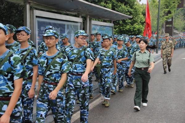 队伍出发后,旗帜在飞扬的尘土中高高地扬起,每一个新生穿上迷彩,接受一份半军人的挑战。在行进过程中,士气高昂,意志坚强,充分体现了前期军事训练的成效。途中进行了传歌活动,歌声慷慨激昂,整支队伍健步如飞,气势如虹。