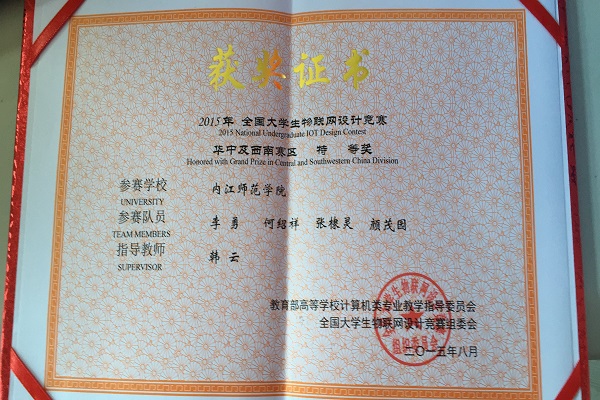 2015年8月4日-6日,2015年全国大学生物联网设计竞赛(TI杯)华中及西南赛区复赛在华中科技大学举行。经过激烈的角逐,计科学院韩云博士带领的李勇等四名同学在此次复赛中获得特等奖,成功入选全国决赛。