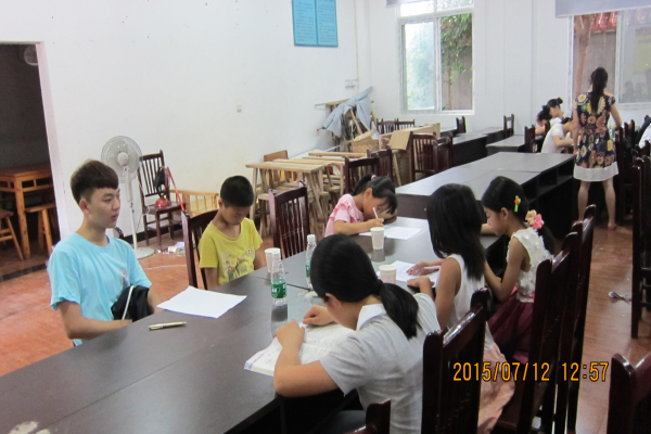 7月13日,是“爱心传递,与梦齐飞”三下乡义务支教队正式授课的日子。支教队的一行8人早早地到达活动开展的地点——靖民镇政府会议室,首先映入眼帘的是一群守在教室门口热情的家长和孩子。支教老师迅速地跑到门口,队长田琴、唐欢与学生家长们交谈并再次确认登记学生的个人情况信息。其他成员则开始打扫。随后在队员们的配合下,根据学生们的年龄、年级将报名的学生分成了6个小组,每个队伍成员主要负责一个小组。剩下两个则提供后勤服务以及安全问题。