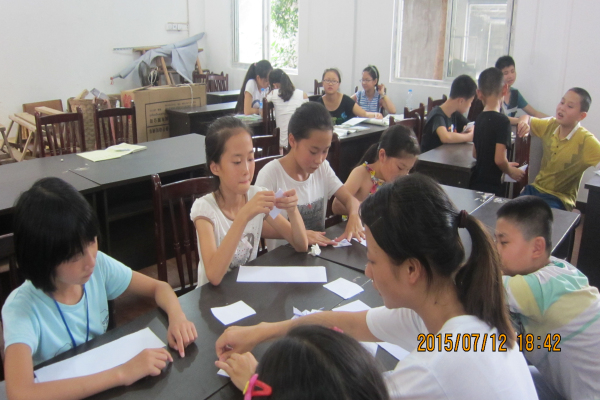 第二节课,是折纸手工课。每一位老师都将自己的独门手工技巧交给学生。夏健森老师拿手的是折心形五角星,青蛙等,唐欢老师擅长折纸花,卓招刚老师擅长折纸抢……。总之这是最欢乐的一节课,所有的学生都兴奋的围着自己老师的旁边:老师,之后怎么折呀?认真的、热切地学习老师折纸的每一个动作。每一位学生最后都学会了不同的折纸技巧。地上爬的,天上飞的,水里游的,应有尽有。在欢笑声中下午过去了。