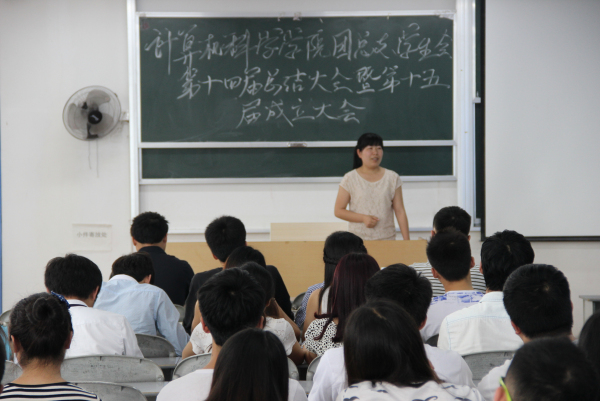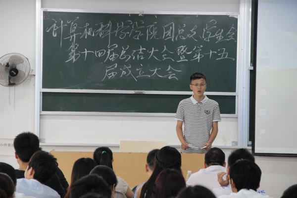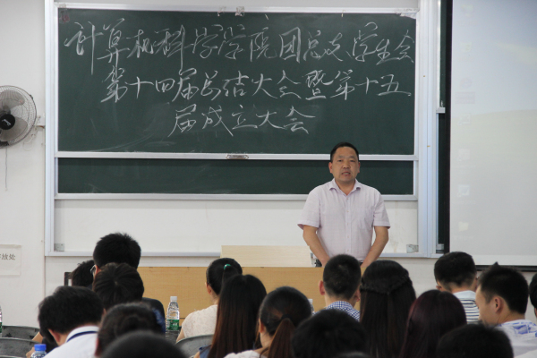 大会第一项议程,党总支书记徐大军致辞,他首先表达了第十四届团总支、学生会全体成员不辱使命、完成任务的祝贺,并感谢他们在过去一年中的无私付出,他们留下的良好的意志品质将会继续给学生会带来好的影响。接着,他宣布第十五届团总支、学生会正式成立,他对新的接班人们提出了以下几点要求:一、以身作则,树立为同学们服务的思想;二、任何时候,学生干部都代表着学院的形象,因此,学生干部要起到带头作用,为同学们树立榜样,学生会代表计科形象,是我院的精英,在寝室和学习方面都是作为考核的标准之一,因此学生会成员首先应该做好表率。三、要严格遵守习总书记提出的“守纪律、守规矩”精神,学生干部首先作为青年学生,应该做到遵守校规院纪,注意言论,言行统一;四、始终要保持勤奋,踏实地工作,学习作风,作为学生干部,首先要学习好自身专业,完成多个学科的学习,与此同时,按质按量完成各项工作,珍惜学生会的工作机会,切实提高工作能力;五、所有同学相互配合,精诚团结,传承学习工作的优良传统;六、保持不断学习的精神。专业的学习,工作的相n学习,取长补短,不断进步,多加交流。