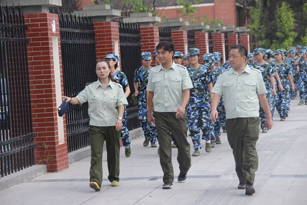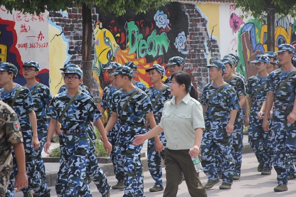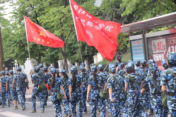 上午九点整,炙热的阳光早已洒满这座城市,全体参训人员从田径场出发,途经西区校门,兰桂大道,兴隆路,大千路等地。再由东区至西区校门方向返回出发地点。一路上,我院参训人员队列整齐,有序。酷热的天气没有丝毫减弱的预兆;为了完成此次任务,一路上,同学们边走边吼着口号,唱着歌,不断给自己加油鼓劲。