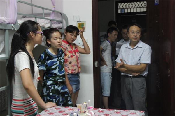 9月1日晚,计科学院院长刘益和,党总支书记徐大军,副院长李尧、唐年庆,辅导员吴昊老师以及2014级班主任张利强、冯松军及部分学生会干部前往1、7、8、13幢新生寝室看望2014级新生,了解新生住宿、军训情况。