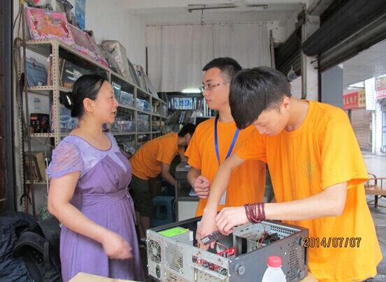 上午8:30,志愿者们到达了目的地,没有片刻的休息,便立刻投入到工作中。俗话说:“成功是给有准备的人的”。前期的有力宣传中,我们拉横幅、发传单、讲解说明、上门维修。宣传点的志愿者也积极、耐心的为大家讲解电脑知识。通过志愿者们的积极努力,前来寻求帮助的人越来越多。从质疑到好奇再到信任,到热切期盼我们下一次的到来。虽然我们经历了社区居民明显的态度变化,但居民的变化就是对我们工作最大的肯定。随后,居民们热情的拿出水果款待志愿者,志愿者都礼貌的谢绝。居民们这样的热情让志愿者们累并快乐着,也让志愿者们更加相信自己。