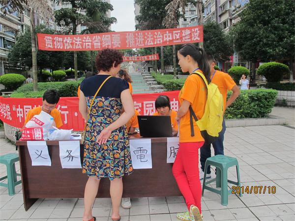 或许这场雨是来考验我们是否有不畏艰苦的决心,在我们走出校门不远后,雨便停了。8:30,我们到达了目的地。刚开始,小区的工作尤为不好开展。这里的居民们秉承“世界上没有免费的午餐”的想法,不相信会有免费维修电脑这样的好事。尽管我们再三强调我们是义务维修电脑,但还是难以留住居民们前进的脚步;难以得到居民们肯定的眼神;难以获得居民们信任的支持。但是从另一角度来看,现在社会上有很多诈骗事情出现,居民们对我们防范,这也是人之常情。为了消除他们对于我们的顾虑,几名队员采取了传统的吆喝方式,他们举着横幅大声吆喝着:“走过,路过,不要错过,内江师范学院义务维修电脑了!”。当遇到遇见居民疑惑的目光时,他们主动出示证件。还有一部分队员拿着宣传单,跑商铺,进小区。皇天不负有心人,最终我们的努力得到了回报。居民们开始相信我们,上前询问,并表示愿意让我们来为他们的电脑维修。当我们下午离开的时候,社区的阿姨还让我们留下电话,希望我们多去他们那里搞这样的活动,给他们的电脑进行清理维修、重装系统、普及电脑知识等。