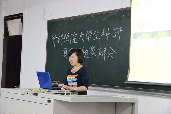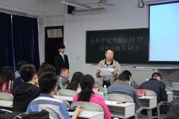 4月28日下午4点,我院在五教北101举行大学生计算机科研项目答辩会,出席此次答辩会的有计科学院院长刘益和,党总支副书记徐大军,副院长唐年庆,何文孝副教授,辅导员李倩倩以及各项目指导老师,学院的一些专业教师以及科研项目小组成员。