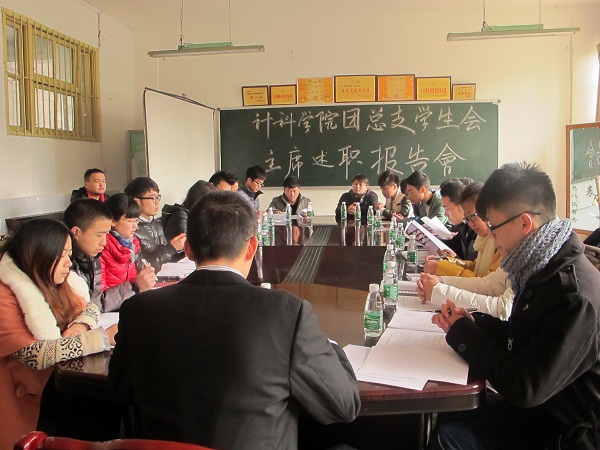 经过一系列精心的策划准备,计科学院于2013年12月27日中午12:30在计科学院原系办召开了第十三届团总支学生会主席述职报告会。校学生会副主席胡飞、校团委组织部副部长江伟出席了本次报告会,计科学院各班班长、团支书、团总支学生会部分学生干部参加了本次会议。