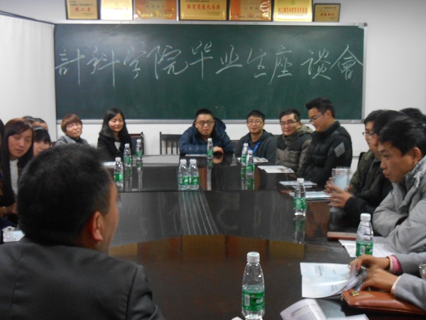 11月29日晚7点半,“计科学院毕业生座谈会”在原系办隆重举行。计科学院院长刘益和、党总支副书记徐大军、辅导员李倩倩、吴昊,班主任李游等重要领导出席了本次会议。我系毕业生代表参加了本次会议。本次座谈会由党总支副书记徐大军主持。