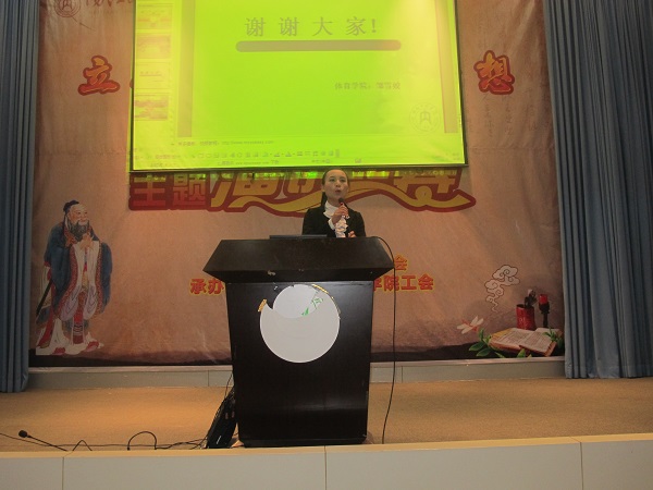 整场比赛紧张而有序,参赛的各位选手激扬文字,其中最引人入胜的是计科学院刘丽娜老师的演讲,刘丽娜老师以“点滴育人”为主题,以优美的语言、真挚的情感阐释了自己对教育这项事业的理解,表达了对教育事业执着的追求和对学生无比的热爱。刘丽娜老师还把自己与学生之间的感人故事讲述给大家,她的真情流露感动了在座的每一位同学,赢得了在场所有观众的掌声。