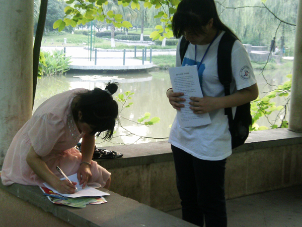 早上的雨终于停了,我们团队开始了今天的征程,由于天气的原因,我们的队员分小组行动,选择了不同的道路进行此次的宣传活动并做问卷调查。我们把传单递给过往的群众,顺便解说此行的目的以及宣传的资料。大多数情况下都是让群众拿着宣传资料自己看。但是,今天遇到了几位不识字的大爷,在我们讲明来意后,他要求我们的队员念给他听。队友欣然应允了,随后按着大爷的要求,用四川话读给他听,满满一页的资料,队友便是念得一字不漏,念完了,队友还低声询问大爷还有没有什么不清楚的地方,好给他讲解。大爷听完后,说道:“环境不是靠一个人就能维护好的,我们应该从自己做起,从身边做起!团结起来,把环境做得更好!”他非常的感动,还表扬我们是“好孩子”。