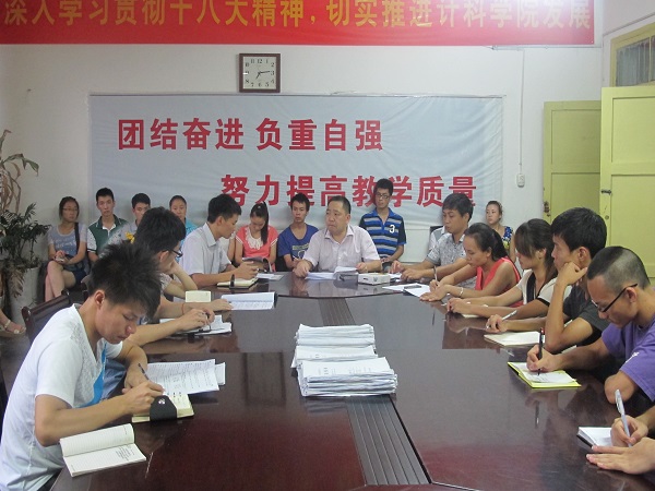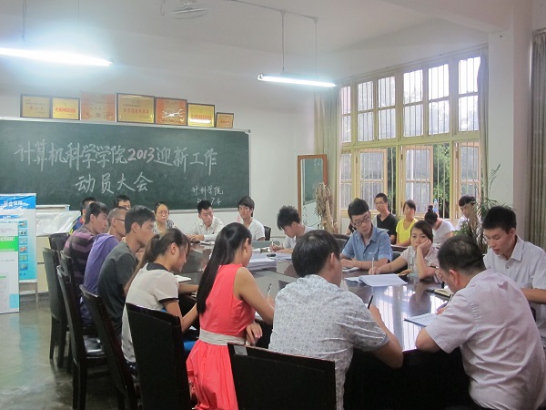 为了使新生接待工作有条不紊地开展,计科学院于7月4日晚上7点在原学院会议室召开了2013迎新工作动员大会,出席本次会议的有党总支副书记徐大军、辅导员吴昊老师、辅导员刘丽娜老师、学生会干部以及各班班长。