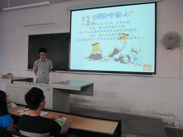 为了加强同学们的诚信意识,培养德才兼备的优秀人才。让同学们从思想上重视道德,从行动上体现道德,从奉献中感悟道德,从成长中体验道德,计科学院各班分别于上星期召开了以‘加强道德建设,提高自身素质’为主题的主题班会。