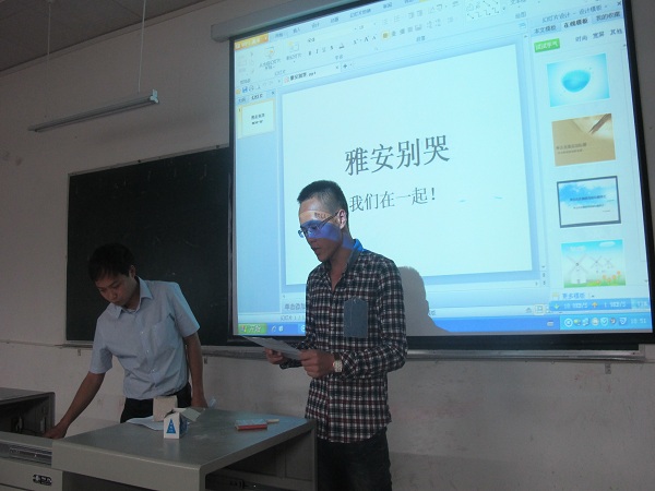 为深切缅怀雅安芦山地震遇难的同胞们以及对受灾的同胞传递我们共同的祝福,计科学院于4月21日晚召开了“祈福雅安”“雅安不哭,我们与你同在”等一系列的主题班会,辅导员吴昊老师参加了本次班会。