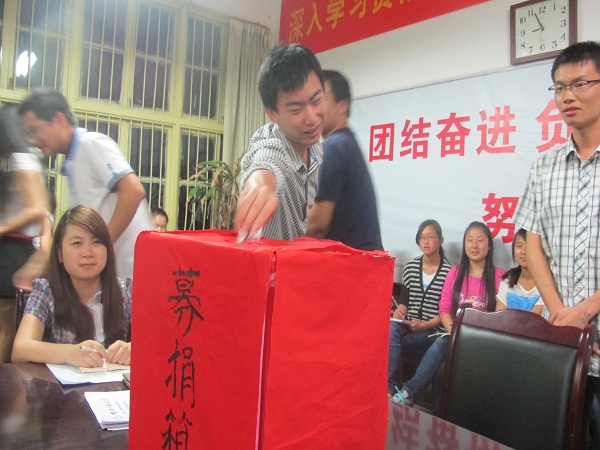 在募捐活动结束后,学生会主席蒲勇通知各班班长,在班上组织同学进行募捐活动,不论多与少,只要共献爱心,伸出援助之手,都能帮助灾区同胞重建美好家园。