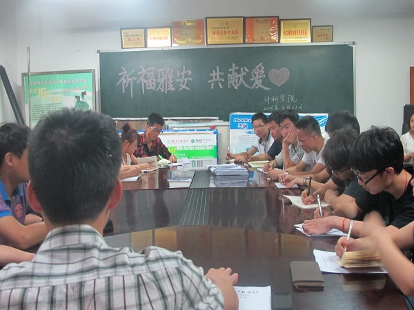 4月22日20点50 分,计算机科学学院在原系办会议室举行了祈福雅安共献爱心的募捐活动,参加本次活动的人分别有辅导员李倩倩老师、辅导员吴昊老师、学生会干部成员以及各班班长。