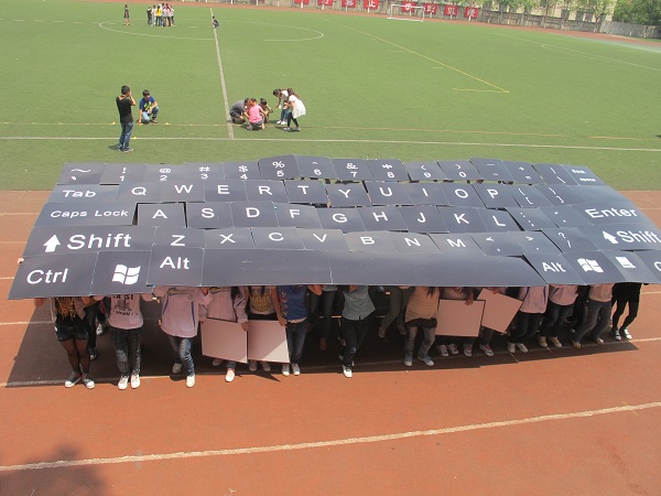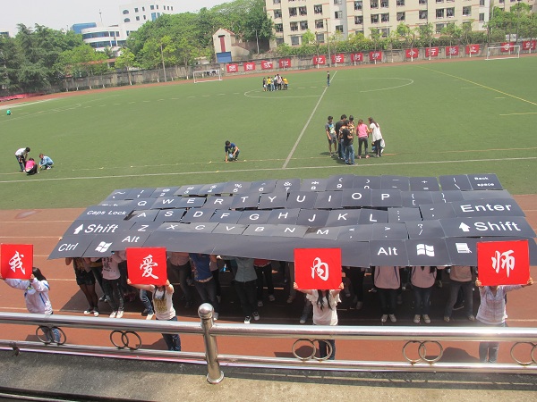 彩排开始,领队带领整个方阵从主席台左侧的跑道出发,走到主席台前,全体高喊计科口号“计科新帆,非同一般,奋勇拼搏,超越自我”,并举起手中的纸板,构成一个键盘。随后,在拼出的键盘上用拼音打出“我爱内师”的字样。党总支副书记徐大军在演练结束后,对全体运动员员在这段时间内的辛苦训练表达了感谢,表示同学们的付出老师们都明白,相信这也是同学们宝贵的财富,同时还指出方阵在拼写过程存在的小小瑕疵,最后预祝全员在运动会上取得优异的成绩。