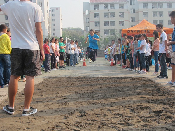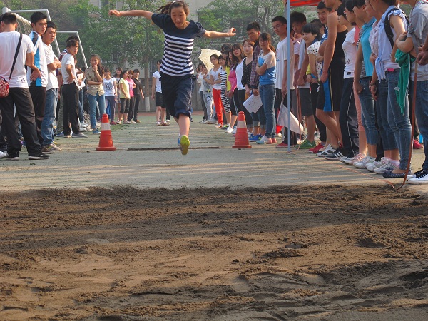 比赛一开始,现场气氛就显得相当热烈,随着裁判员手中的红旗挥动,8号选手雷晓红做好准备,立定、摆臂,双脚用力地蹬地,腾空后一条腿向前方迈出,迅速落地,紧接着双脚弹跳,在空中划出一道弧线后落入沙坑,跳出7.12米,她精彩的表现引起了在场观众的欢呼。30号选手刘小玲神采奕奕,自信满满,纵身一跃,动作干净利落,在身后留下了一条完美的曲线,跳出了7.34米的好成绩,赢得了阵阵掌声。选手们尽自己最大努力为计科学院争光,全力以赴的竞技精神更是可敬可佩。